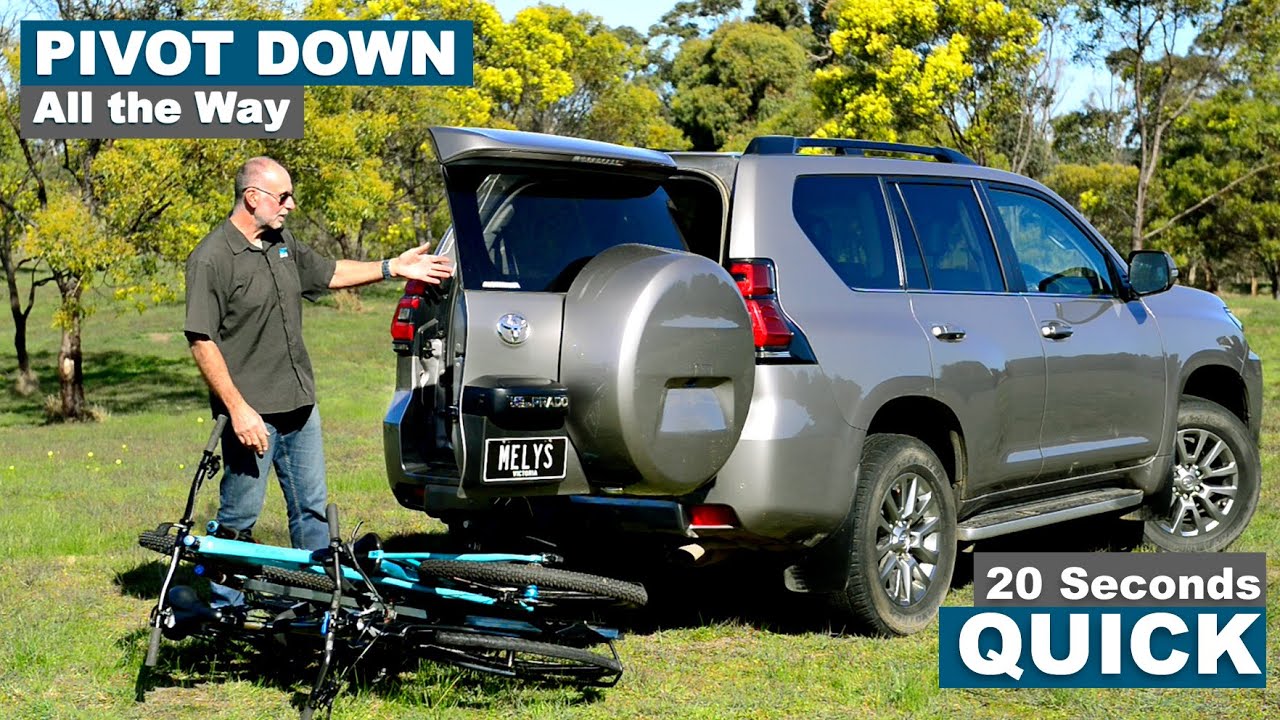 The iSi vehicle mounted carrier pivots to the ground with four bikes on board, providing complete access to the rear of the vehicle without unloading.